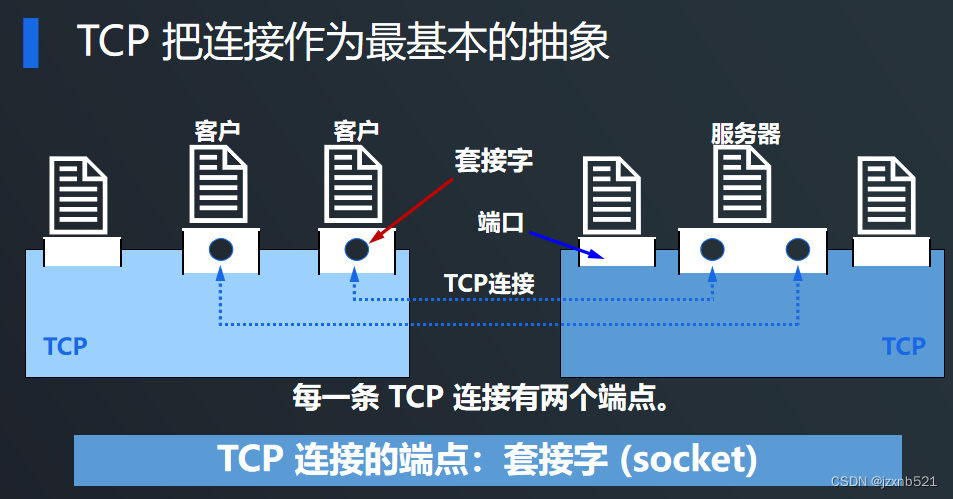 - TCP 是面向连接的运输层协议:每一条 TCP 连接只能有两个端点 (endpoint),每一条 TCP 连接只能是点对点的(一对一)。