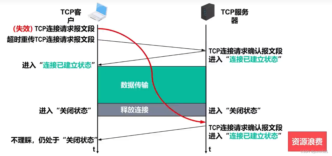 (5)一段时间后,之前滞留在网络中的那个失效的TCP连接请求报文段,到达了TCP服务器进程。TCP服务器进程会误认为这是TCP客户进程又发起了一个新的TCP连接请求。
