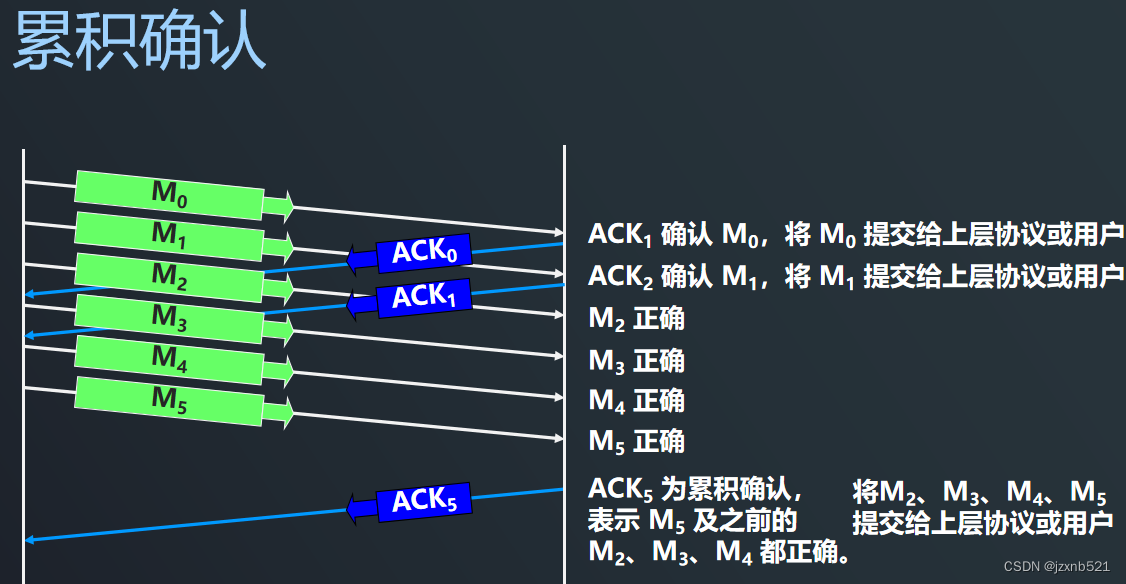 - 累积确认:接收方对按序到达的最后一个分组发送确认,表示:到这个分组为止的所有分组都已正确收到了。