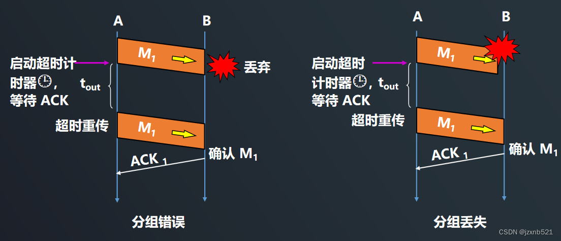 解决方法:①超时重传 A 为每一个已发送的分组设置一个超时计时器。 A 只要在超时计时器到期之前收到了相应的确认,就撤销该超时计时器,继续发送下一个分组 M2 。