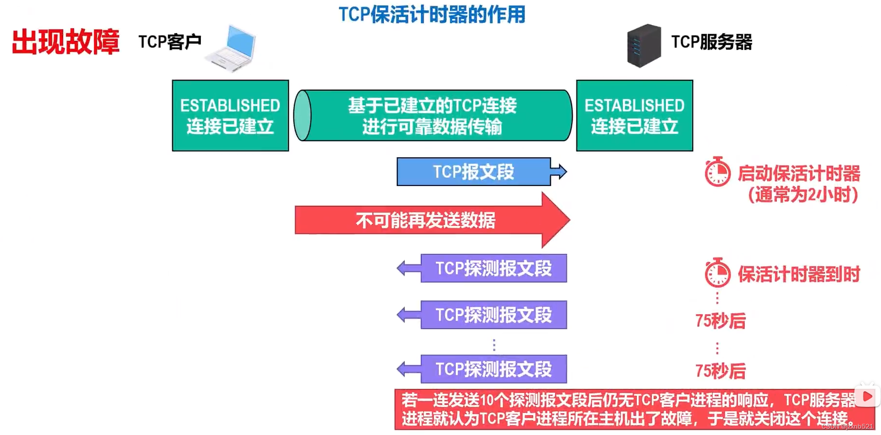 - 若保活计时器在定时周期内未收到TCP客户进程发来的数据,则当保活计时器时后,TCP服务器进程就向TCP客户进程发送一个探测报文段,以后则每隔75秒发送一次。若一连发送10个探测报文段后仍无TCP客户进程的响应,TCP服务器进程就认为TCP客户进程所在主机出了故障,于是就关闭这个连接。