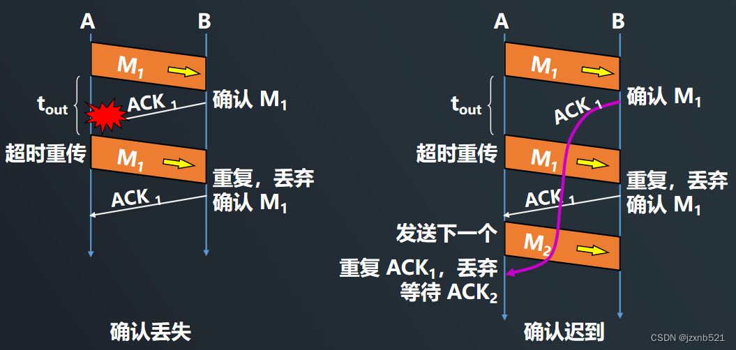 ②确认丢失:若 B 所发送的对 M1 的确认丢失了,那么 A 在设定的超时重传时间内将不会收到确认,因此 A 在超时计时器到期后重传 M1。