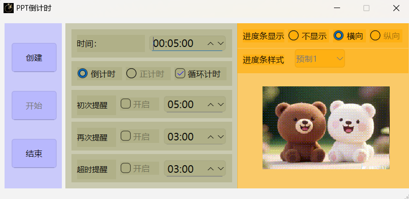 在选择好时间和进度条样式之后,就可以点击最左侧的按钮区的“创建”按钮,之后会在屏幕最顶部中心位置出现一个倒计时窗口(和一个进度条),然后点击“开始”按钮,程序会自动判断当前电脑有没有进行全屏PPT演讲,若有PPT在全屏播放,则时间框会自动开始倒计时,并且会在超时后字体颜色变为红色,以便起到提醒的作用,开启后的时间框如下图所示,左侧显示进度条,右侧为时间框。