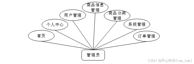 管理员;管理员使用本系统涉到的功能主要有:首页、个人中心、用户管理、商品信息管理、商品分类管理、系统管理、订单管理等功能。管理员用例图如图3-1所示。