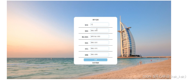 用户注册,在用户注册页面通过填写账号、密码、确认密码、姓名、手机、邮箱等信息进行注册操作,如图5-2所示。