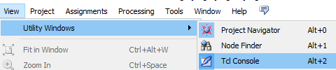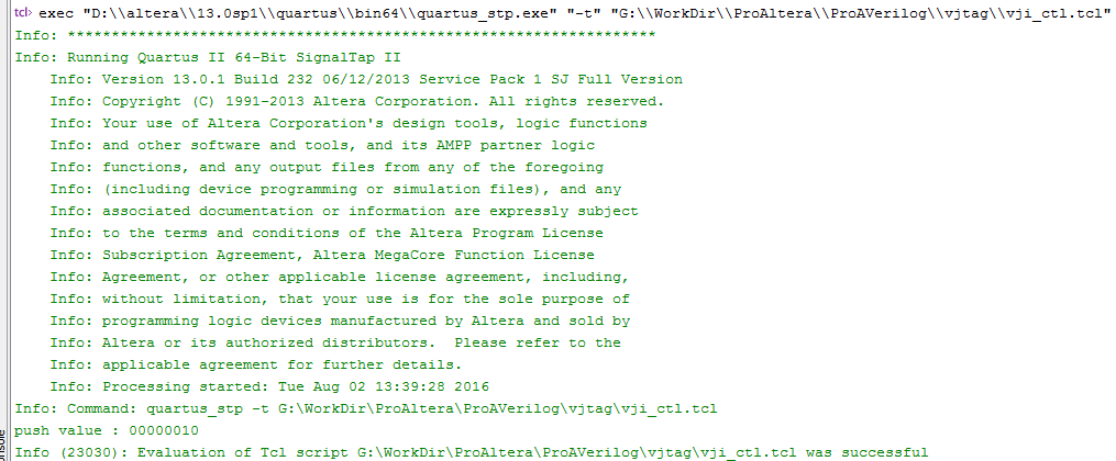 在TCL控制台中,使用 exec "D:\\altera\\13.0sp1\\quartus\\bin64\\quartus_stp.exe" "-t" "G:\\WorkDir\\ProAltera\\ProAVerilog\\vjtag\\vji_ctl.tcl"