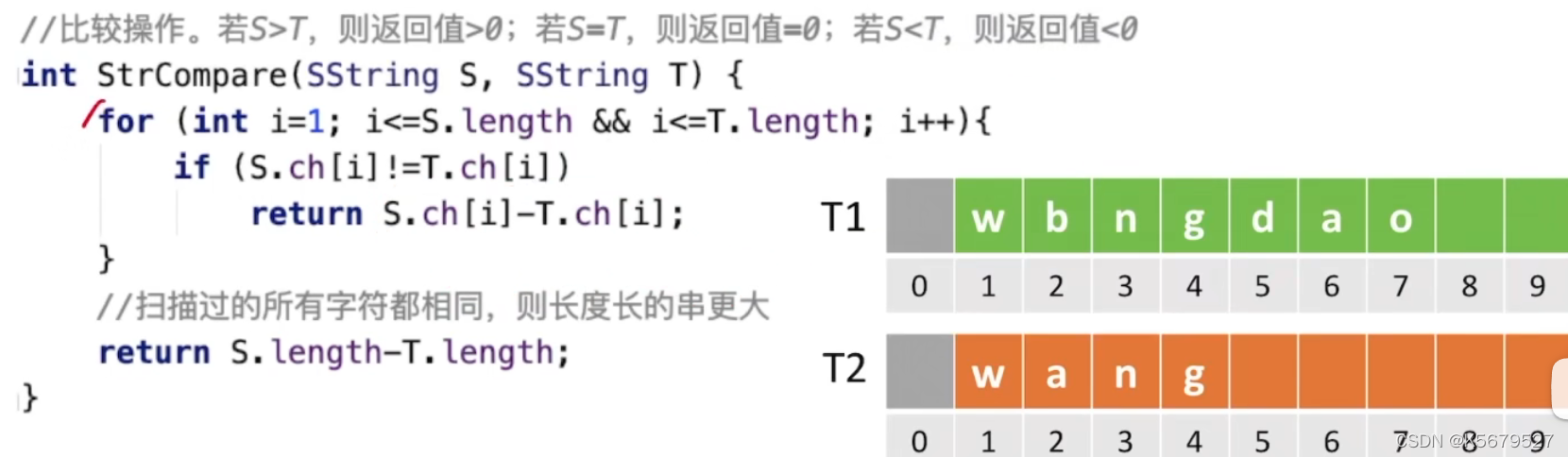 字符串比较:若S>T,则返回值>0;若S=T,则返回=0,若S