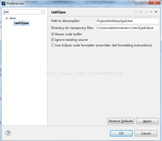 5.将path to decompiler 路径指定到jad.exe的位置,注意如果是放在jdk\bin目录下,需要改成对应的路径。Directory for temporary files无需更改