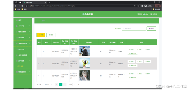 如图5.1显示的就是用户信息管理页面,此页面提供给管理员的功能有:用户信息的查询管理,可以删除用户信息、修改用户信息、新增用户信息,