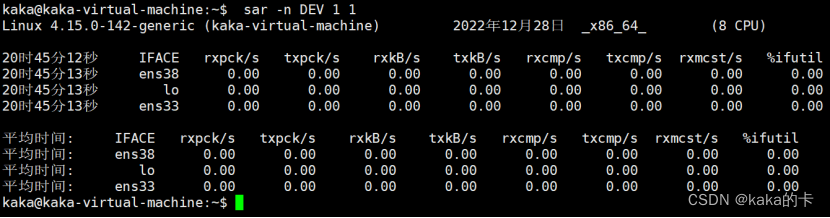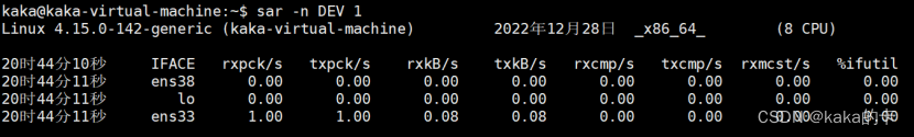 给 sar 增加 -n 参数就可以查看网络的统计信息,比如网络接口(DEV)、网络接口错误(EDEV)、TCP、UDP、ICMP 等等。执行下面的命令,你就可以得到网络接口统计信息:
