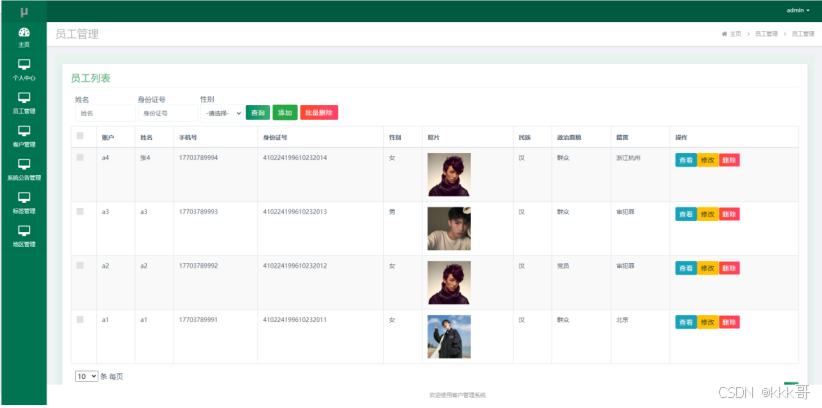 如图5.1显示的就是员工管理页面,此页面提供给管理员的功能有:添加员工,修改员工,删除员工。
