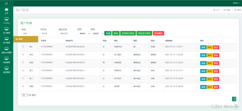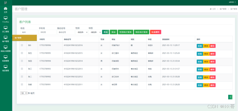 如图5.3显示的就是客户管理页面,此页面提供给管理员的功能有:新增客户,修改客户信息,删除客户信息,查看客户信息,根据性别统计客户,根据地区统计客户。