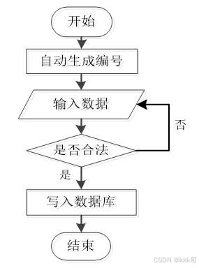 程序的添加功能就是提供给操作者录入信息的功能,不管是涉及到用户信息添加,还是其它功能模块涉及到的信息添加,程序的信息添加流程(如图3.3所示)都是一致的。程序都是先对操作者录入的数据进行判定,这个判定规则是一段提前编写完成的程序代码,当程序判定数据符合要求时,才会把操作者录入的数据登记在数据表里面,比如添加的用户信息,就会把新添加的用户信息写入用户信息的数据表文件里面。
