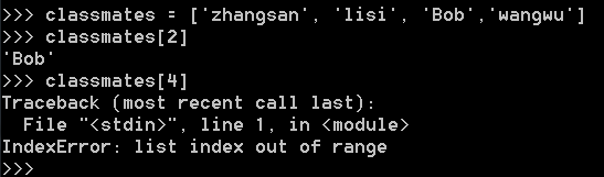 定义:classmates = ['zhangsan', 'lisi', 'Bob','wangwu']