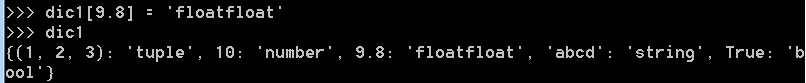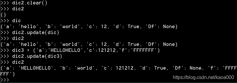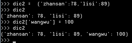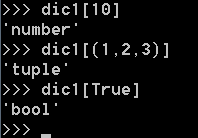 通过与上面修改值进行对比,可以看出:如果key在字典中存在,那就是修改,如果key在字典中不存在,那就是增加。所以,字典中的key是唯一的,不会存在重复的现象,而list与tuple中是可以存在重复值的。