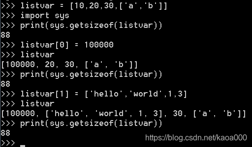 通过上面的测试,可以看到,只要是修改元素,不管修改(不能增删)的内容变化多么大,listvar的内存大小都不变。