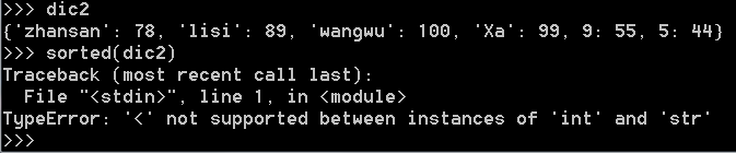 如果删除时指定的key不存在,就会报错。通过对象本身的pop()方法删除一个键值对,返回了值,为刚删除的键值对的值数据。当key类型一致时,进行排序,sorted()成功。
