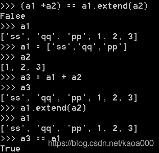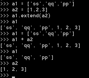 扩展是在一个list后面进行,相当于将a2的元素按顺序一个一个append()到a1中。a1扩展后其值改变了。而a1 + a2,其返回结果与a1扩展后相同,但是a1和a2值不变,是形成了新的量。