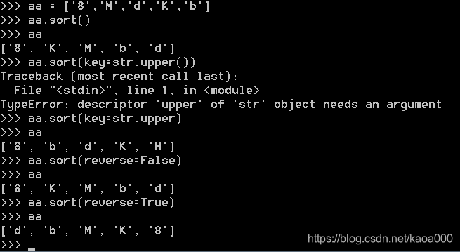 sort()不带参数,就是按照ascii表的编码来进行比较数字小于字母,大写字母小于小写字母。reverse参数,指定排好序的列表是否翻转,默认就是False,不翻转,按照ascii表顺序,如果为True,表示翻转,也就是按照ascii表的反序排序。key参数很复杂,可以指定一个函数,用来处理每个元素,list按照函数处理后的结果排序。如上例中使用了str.upper,就是将字符串变为大写再进行比较排序。