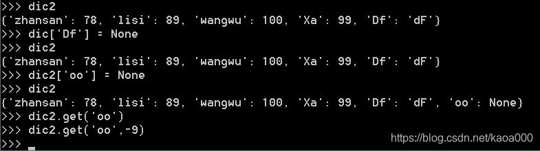 上面是一个很有意思的测试,当要修改字典中的某个键的值时,改成None是不成功的,存在的key,值为None,相当于不做修改,但是,可以增加一个值为None的键值对。这时判断key是否存在时肯定要出现混乱,不存在,返回None,存在,也有可能是None。对于get()的第二个参数,实际编程中一定要仔细考虑其取值,就是一定不能在键值对中的值域中出现。