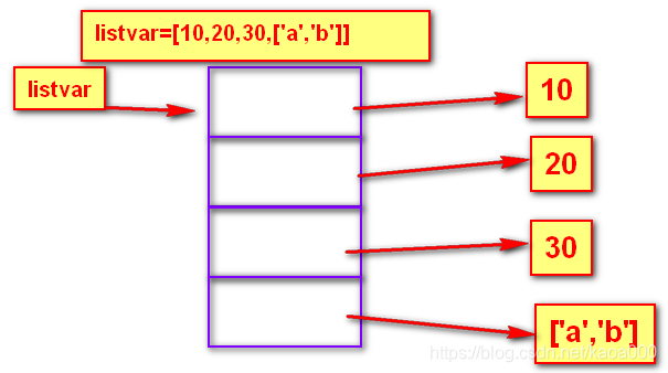 python中所有的变量存储都是对象的地址,list中的元素,在list中存储的也是元素的地址。如下图