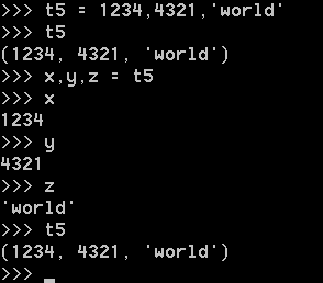语句 t = 12345, 54321, 'hello!' 是 元组打包 :值 12345, 54321 和 'hello!' 被打包进元组。其逆操作也是允许的