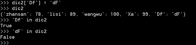 通过第二步测试,in操作是在key中进行的,不会查找value,即值域中的内容,相当于‘xxx’ in list(dic2),在key的列表中查找。
