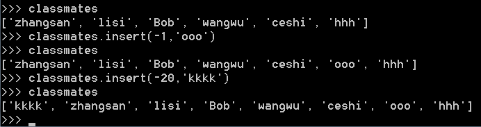 insert的第一个参数也可用负整数表示:注意的是用负数无法在最后插入元素,当第一个参数的绝对值大于列表长度,都是是第一个位置,即列表头插入。