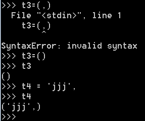 一个特殊的问题是构造包含0个或1个元素的元组:为了适应这种情况,语法有一些额外的改变。空元组可以直接被一对空圆括号创建,含有一个元素的元组可以通过在这个元素后添加一个逗号来构建(圆括号里只有一个值的话不够明确)。