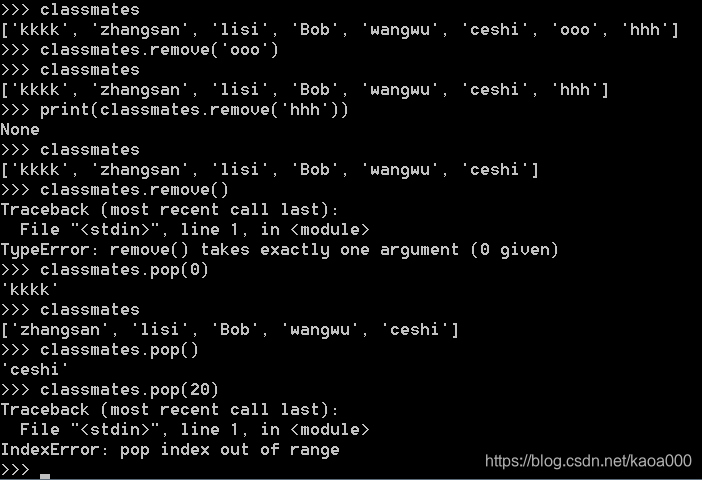 remove()删除list中匹配参数内容的元素,没有返回值。并且,如果list中有重复的元素。remove()只删除索引最小的那一个。如果删除的内容不在list中,报错。
