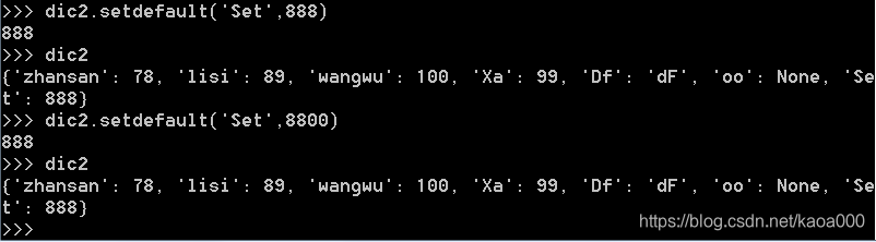 可见。setdefault()方法是:如果不能存在key,就 在字典中增加相应的键值对,返回新增加的键值对的值,如果字典中已经存在key了,则不作改变,返回已有键值对的值。
