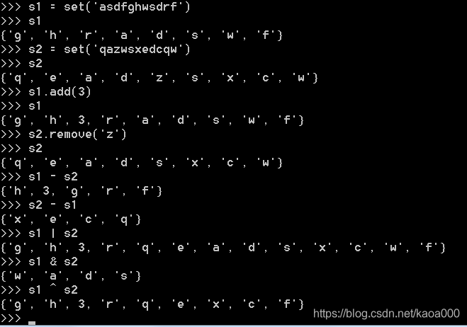 通过add(key)方法可以添加元素到set中,可以重复添加,但不会有效果,通过remove(key)方法可以删除元素,set可以看成数学意义上的无序和无重复元素的集合,因此,两个set可以做数学意义上的交集、并集等操作: