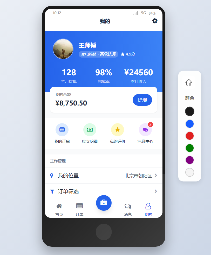 为确保服务人员能接收到最相关的订单信息,用户可以在首页顶部选择或切换自己的服务区域。系统将根据所选区域智能推送范围内的订单。