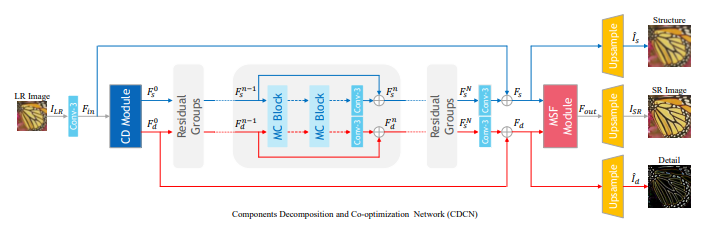 - 提出了一种组件分解与协同优化网络co-optimization network(CDCN),,也就是增加了结构图和细节图两个输出,进行超分的学习