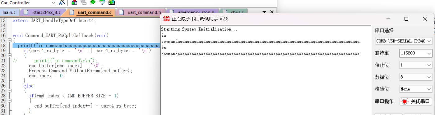 根据以上现象我推测:在115200波特率的情况下,串口的发送无法再很短的间隔连续发送超级多的字符.因此才会在要发的数据多的时候只发两条.于是我又测试一个超长的字符串的发送 printf("in commandaaaaaaaaaaaaaaaaaaaaaaaaaaaaaaaaaaaaaaaaaaaaaaaaaaaaaaaaaaaaaaaaaaaaaaaaaaaaaa\r\n");我猜它依然会发出来两次.结果如图