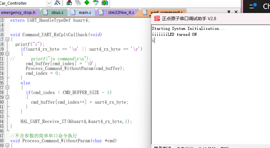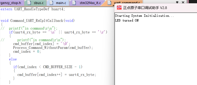 我一开始很好奇为什么串口偏偏只发两次,按理说它应该会发8次才对,而且我的LED ON回传信息居然不见了!我转头去问AI,结果AI跟我装死,非要说因为\r\n判断两次所以发了两次.我跟他说你看看printf("in command")我放在判断\r\n的前面了,你别胡说.它想了2分钟然后继续跟之前一样胡说......