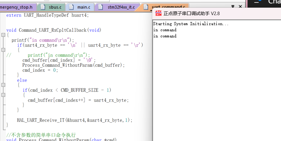 我在命令表中执行led on的命令的时候,会有一个printf("LED ON\r\n");但是我发现如果我在回调函数中加入printf("in command\r\n");的调试信息时,串口只显示发送了两次"in command",而"LED ON"却没有显示.如图: