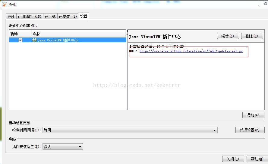 (我这里已经改过了。原来的地址应该是http://visualvm.java.net/uc/7u60/updates.xml.gz)
