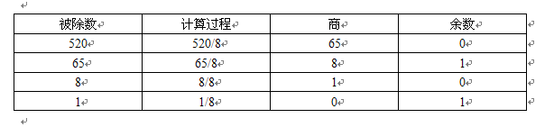 10进制转为8进制的方法与10进制转为2进制的方法类似,只是除数由2变为了8,下面看一下10进制520如何表示为8进制,表格表示形式如下: