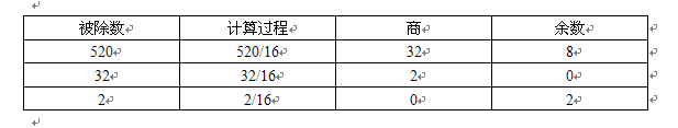 10进制转为16进制的方法与10进制转为2进制的方法类似,只是除数由2变为了16,下面看一些520如何表示为16进制,表格表示形式如下: