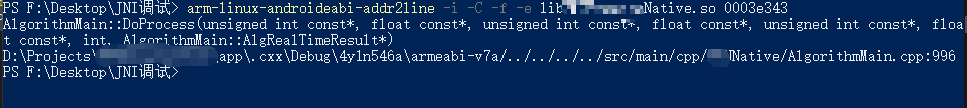 将刚才找到的.so文件拷贝到此目录下,右键运行命令行,输入arm-linux-androideabi-addr2line -C -f -e libXXXXNative.so 0003e343(这里的地址就是在步骤一中找到的地址),回车即可显示崩溃代码所在具体的c++文件和对应的行号,如图: