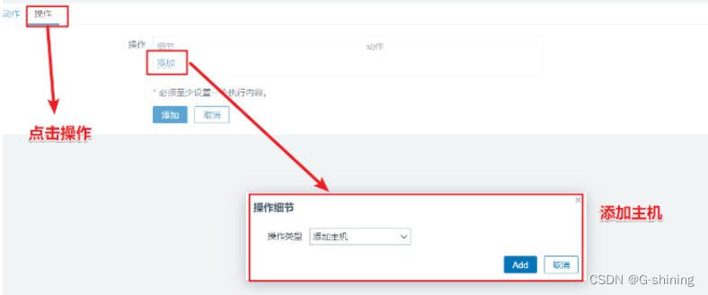 点击上方菜单栏【操作】,点击【添加】,【操作类型】选择 添加主机,点击 【add】