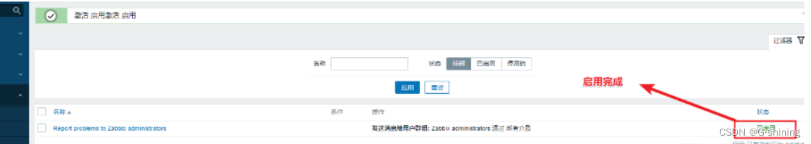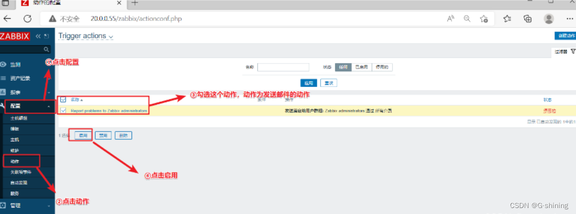 点击左边菜单栏【配置】中的【动作】,选择相对应的动作名称,点击【启用】