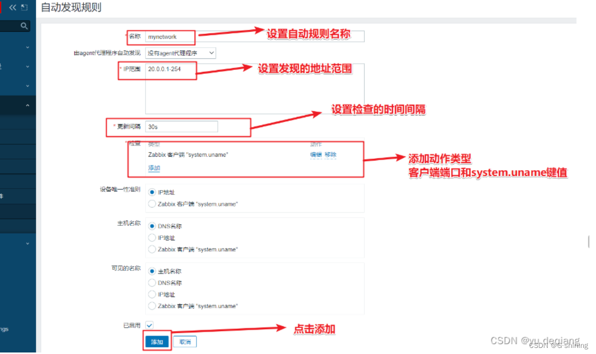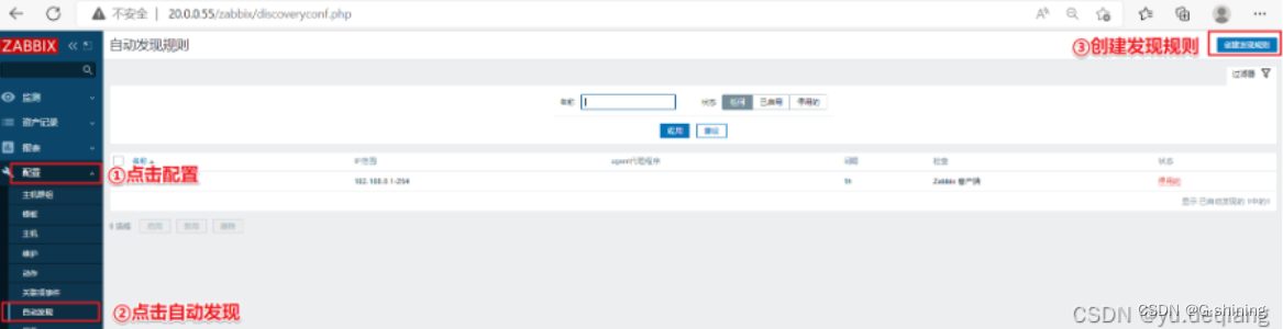 点击左边菜单栏【配置】中的【自动发现】,点击【创建发现规则】