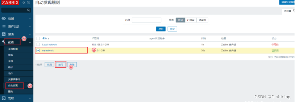 点击左边菜单栏【配置】中的【自动发现】,勾选发现规则,点击 禁用