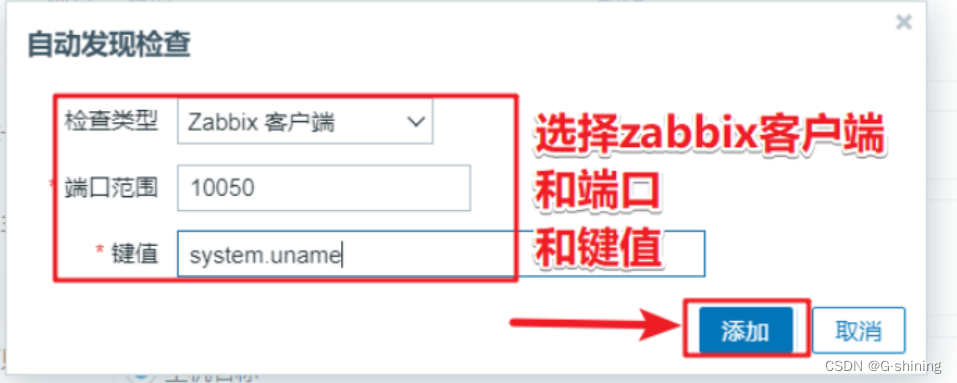 【检查】点击【添加】,【检查类型】选择 Zabbix 客户端,【端口范围】设置成 10500,【键值】设置成 system.uname